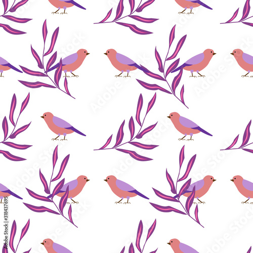 Obraz premium Seamless pattern with fantastic tropical plants and birds, flat style, vector...