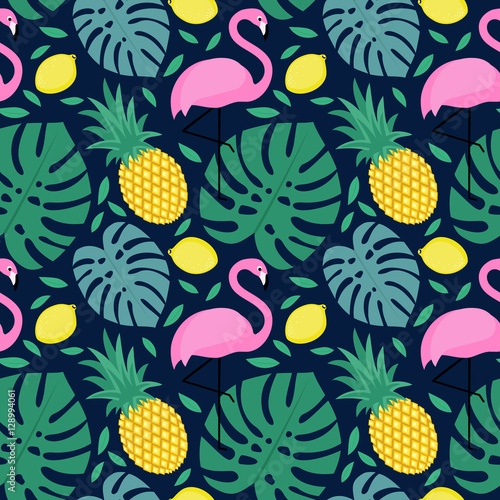 © in_dies_magis, Naklejka premium Seamless pattern with flamingo, pineapple, lemon and green palm leaves on dark blue background. Tropical monstera leaves illustration with fruits and exotic bird.Fashion design for textile, wallpaper.