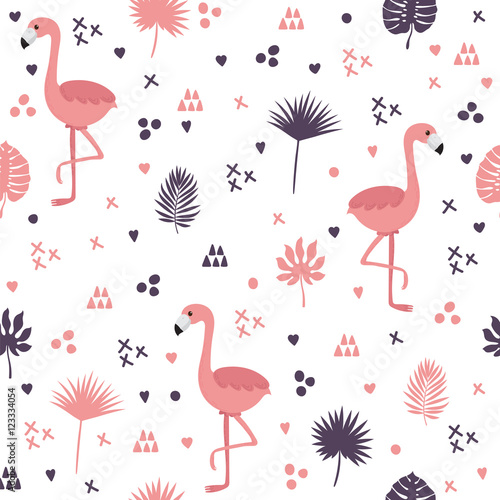 Fototapeta premium Seamless pattern with flamingos and leaves. Cute background with