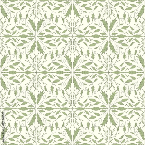 © Sonya, Naklejka premium Seamless Pattern with Floral and Leafy Elements in Green Tones