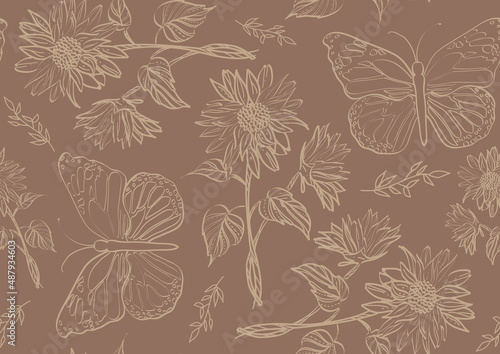 © ammij, Obraz premium Seamless pattern with flowers and butterfly