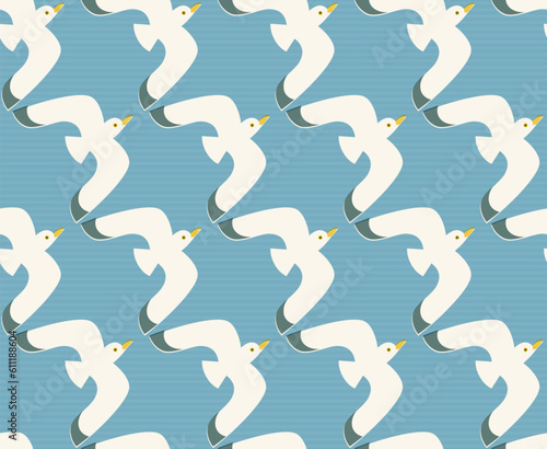 © Torico, Fototapeta premium Seamless pattern with flying gulls. Flat and whimsical illustration of flying seagulls in line on subtle striped blue background.