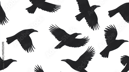 © Mufarokah, Obraz premium Seamless pattern with flying raven silhouettes on a white background. Dark aesthetic