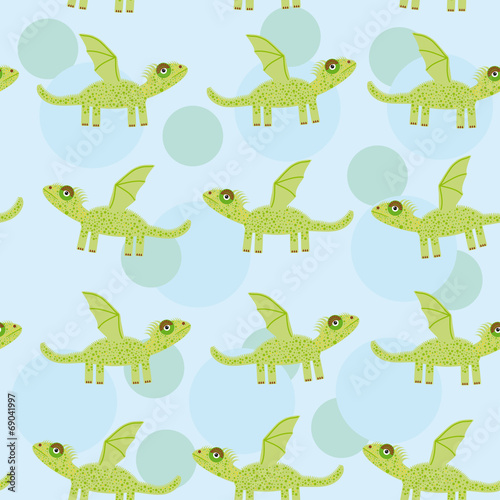 © EkaterinaP, Fototapeta premium Seamless pattern with funny cute dragon on a blue background. Ve