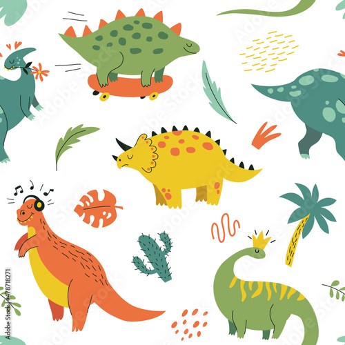 © Tatiana, Obraz premium Seamless pattern with funny dinosaurs in hand drawn style. Creative childish texture. Great for fabric, textile. Isolated on white background vector illustration