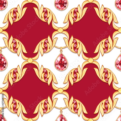 © Gribanessa, Fototapeta premium Seamless pattern with gems and golden scrolls