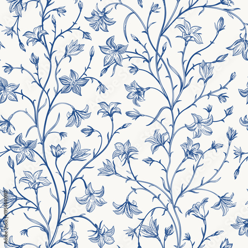 © Lisla, Fototapeta premium Seamless pattern with graceful forest bluebells. Classic blue on white.
