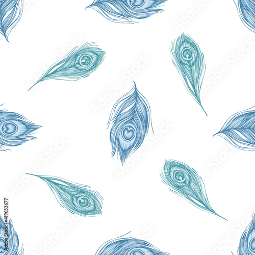 © Sad, Naklejka premium Seamless pattern with hand drawn pastel peacock feathers