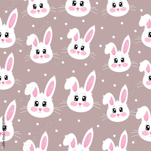© Olga Voron, Obraz premium Seamless pattern with happy cute funny kawaii little bunny on light brown background
