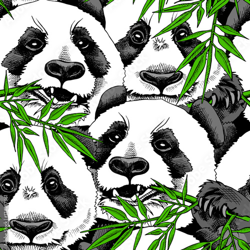 Fototapeta premium Seamless pattern with image of a Panda eating branch of bamboo. Vector...