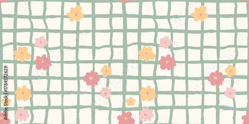 © Radiocat, Naklejka premium Seamless pattern with ink doodle abstract flowers and leaves on grid. Trendy aesthetic green background. Hand drawn vector illustration. Boho, beach, checkered romantic wallpaper.