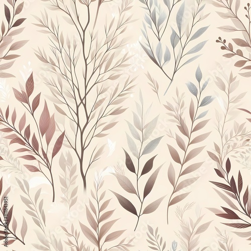 © Polina, Naklejka premium seamless pattern with leaves floral and branches in brown beign colours background, generative ai