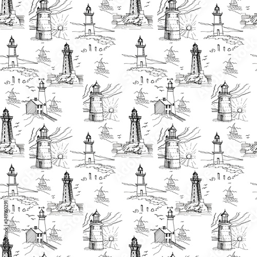 © Paint_art, Obraz premium Seamless pattern with lighthouses. Graphic hand-drawn illustration. Print, textile, paper, background. Vintage, retro, doodle, sketch style. Line, contour, silhouette. Sea, ocean, travel, islands.