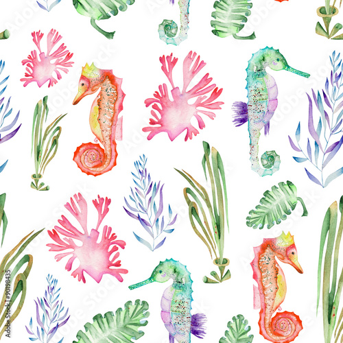© nastyasklyarova, Naklejka premium Seamless pattern with multicolored seahorses and seaweed (algae) painted in watercolor on a white background