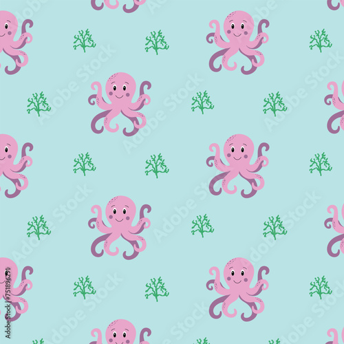 © Sun_Rise, Fototapeta premium Seamless pattern with octopuses and algae. Vector illustration.
