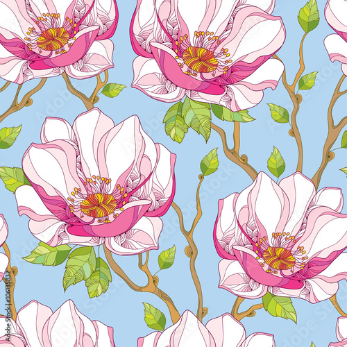Fototapeta premium Seamless pattern with ornate magnolia flower in pink and green leaves on the blue background. Floral background in contour style.