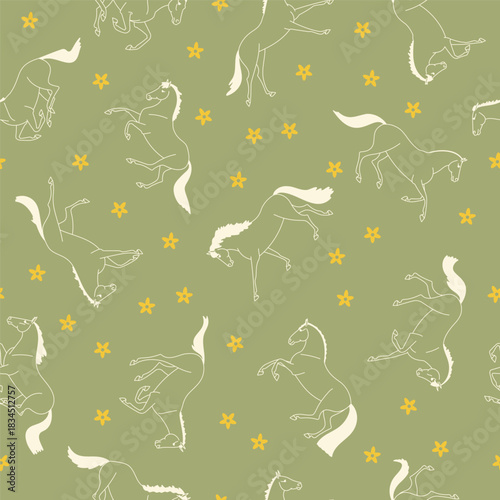 Fototapeta premium Seamless pattern with outlined horses and yellow flowers on a soft olive...