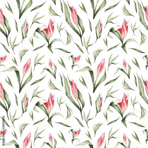 © Siawi_art, Naklejka premium Seamless pattern with pink lilies, buds and green leaves. Spring texture hand-drawn with watercolor. Floral delicate pattern