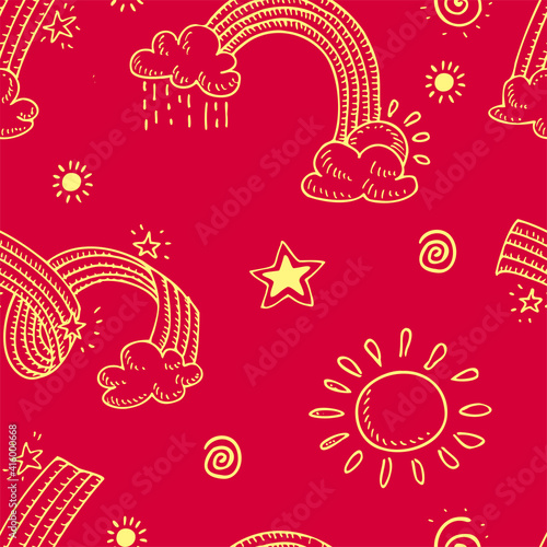 © Анастасия Фирсова, Naklejka premium Seamless pattern with rainbow, clouds and sun. Simple color vector illustration.