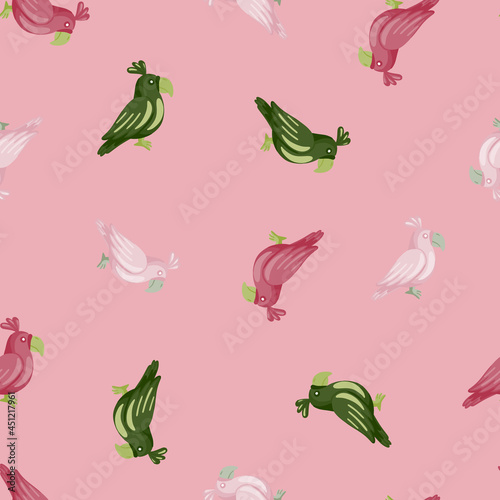 Fototapeta premium Seamless pattern with random pink, white and green parrots elements. Pastel...