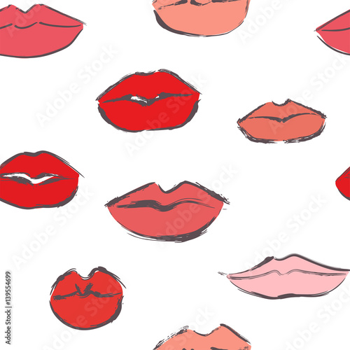 © mila_1989, Obraz premium Seamless pattern with red and pink lips on white background. Vector illustration