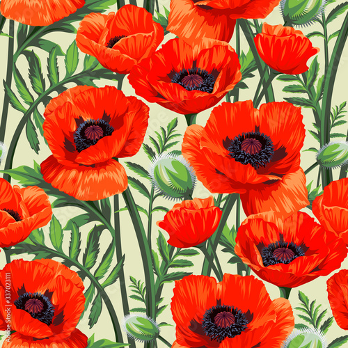 Obraz premium Seamless pattern with red Common Poppy (Papaver rhoeas) flowers isolated on...