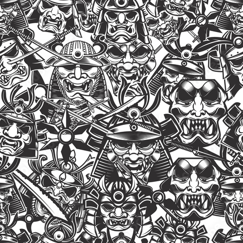 Obraz premium Seamless pattern with samurai masks in monochrome style. Design element for poster, card, banner.