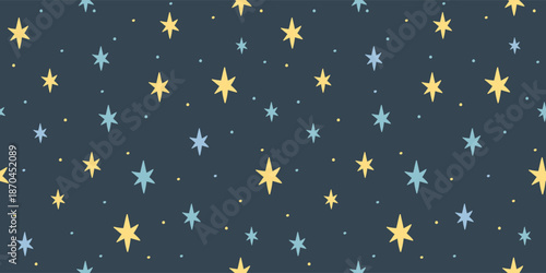 © PixMarket, Naklejka premium Seamless pattern with scattered yellow and blue stars and dots on dark blue background creating starry night effect