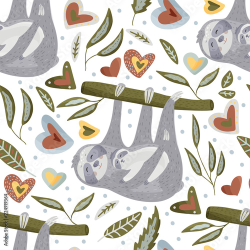 © trihubova, Naklejka premium Seamless pattern with sloths in flat style.