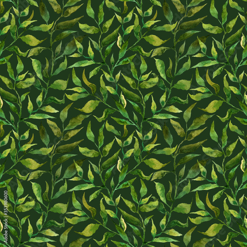 © Dina Guiter, Fototapeta premium Seamless pattern with stylized leaves. Floral endless pattern filled with green leaves. Fresh greenery background, wallpaper, textile print. Watercolor hand drawn illustration on a dark background.