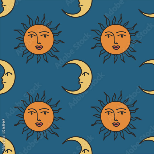 © Екатерина Перанова, Fototapeta premium Seamless pattern with sun and moon. Contemporary composition. Boho wall decor. Mid century art print. Trendy texture for print, textile, packaging.