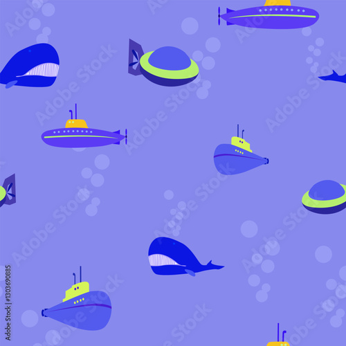 Fototapeta premium Seamless pattern with symbols of the underwater world - submarines and sea whales in a flat style in purple-blue shades for the design of your gaming and entertainment projects on a marine theme.