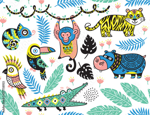 © penguin_house, Obraz premium Seamless pattern with tropical animals