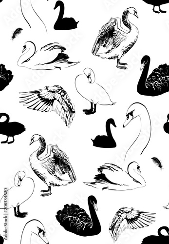 Fototapeta premium seamless pattern with various swans sketches, black and white, vector...