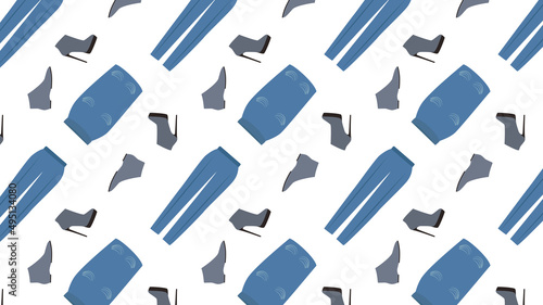 Naklejka premium Seamless pattern with various women's clothing, shoes and accessories in in...