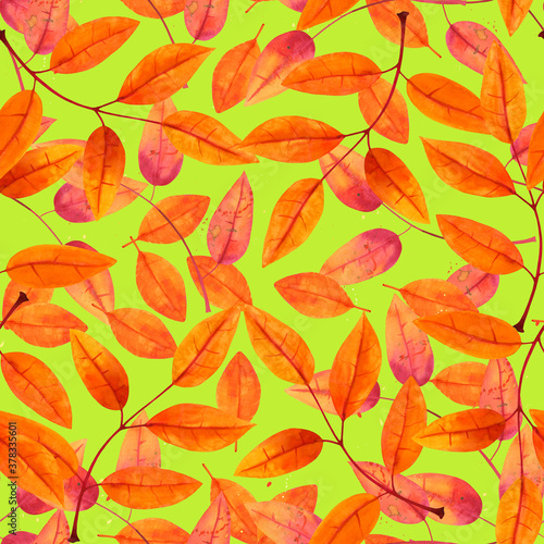 Obraz premium Seamless pattern with watercolor autumn leaves on a vibrant green background,...