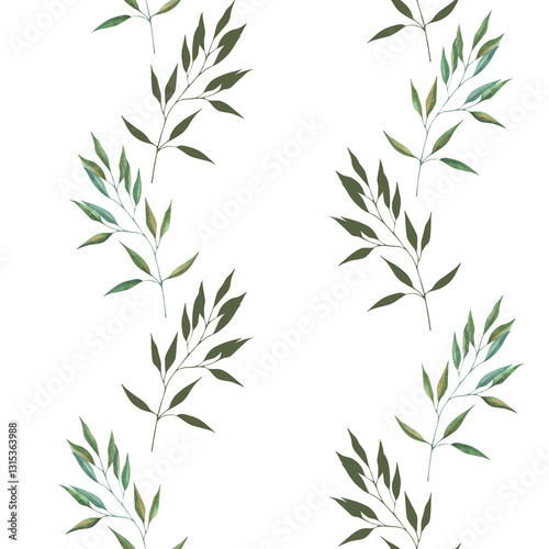 © Tishina, Naklejka premium Seamless pattern with watercolor illustrations of various herbs. Seamless texture with hand-drawn green branches. Ideal for wedding, birthday, seasonal holidays.