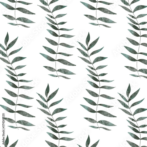 © Elena, Naklejka premium Seamless pattern with watercolor leaves, green twigs. Artistic design. Vector illustration. Isolated on a white background.