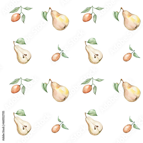 © Mariia, Obraz premium Seamless pattern with watercolor pears and kumquat