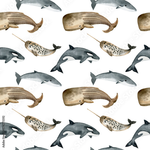 © Tapilipa, Naklejka premium Seamless pattern with watercolor whales.