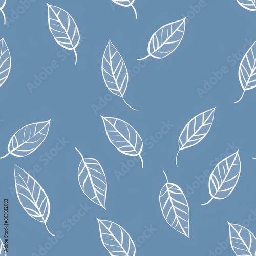 © Witch, Fototapeta premium Seamless pattern with white leaves on a blue background. Nature, floral, botanical, organic, minimalist design. Ideal for textiles, fabrics, wallpaper, wrapping paper, and more.