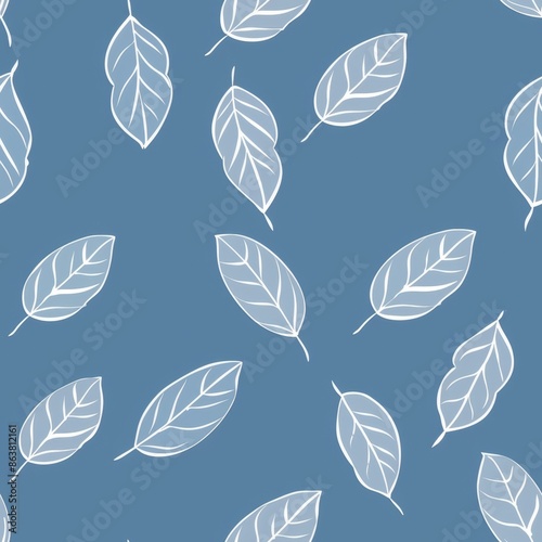 © Witch, Fototapeta premium Seamless pattern with white leaves on blue background. Minimalist botanical print for fabric, wallpaper, wrapping paper. Nature, spring, summer, floral design.