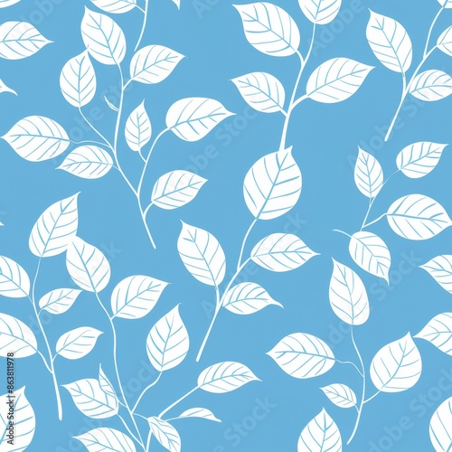 © Witch, Fototapeta premium Seamless pattern with white leaves on blue background. Nature, floral, spring, summer, botanical, design, fabric, textile, wallpaper, wrapping paper, scrapbooking.