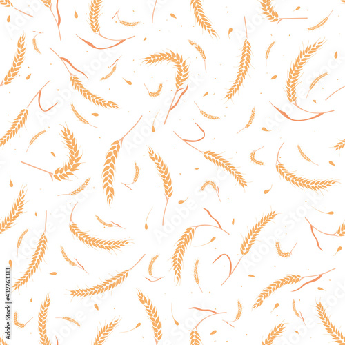 © Konstantin, Fototapeta premium Seamless pattern with whole grain seeds organic, natural ears isolated on white background flat style design vector illustration. Wheat, barley or rye ears with straw chaotic version.