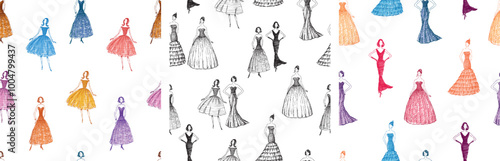 Obraz premium Seamless patterns of sketches cartoon slim young women in evening gowns,...