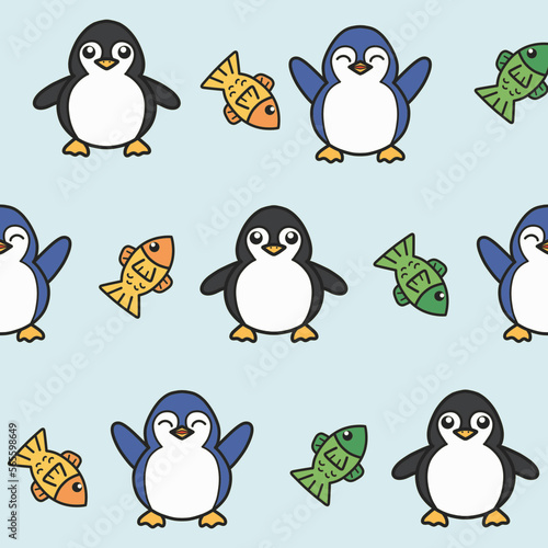 © Nerissa, Obraz premium Seamless Penguins Pattern Design with Light Blue Background