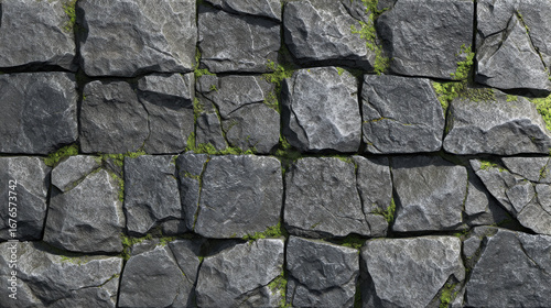 Obraz premium Seamless photorealistic gray cobblestone texture with weathered, cracked stones and natural moss, perfect for architectural visualization and construction 3D projects