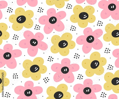 © Meowlina Meow, Fototapeta premium Seamless pink and yellow scandinavian flower pattern.Naive hygge style.