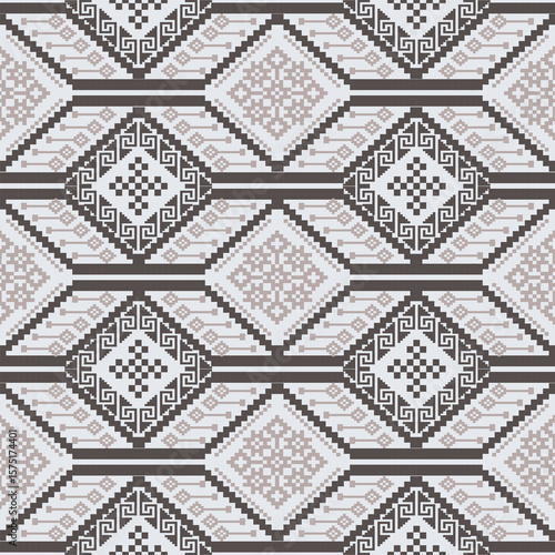 Obraz premium Seamless pixel geometric diamond pattern in white, taupe, and brown, ethnic...