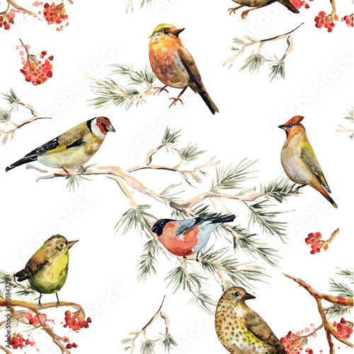 © Aloksa, Fototapeta premium seamless texture of forest birds. watercolor painting